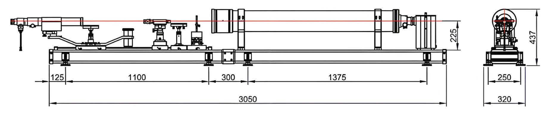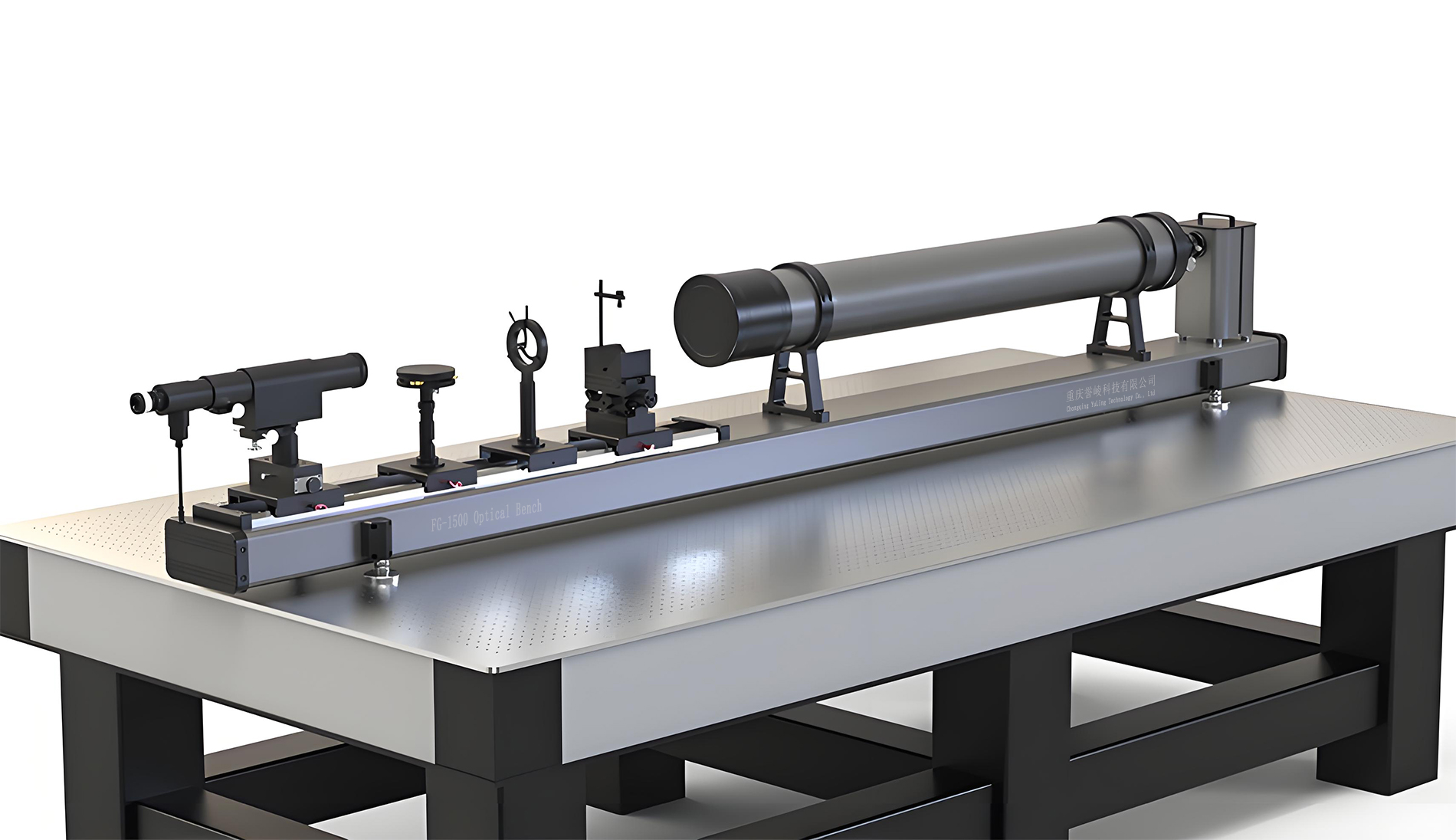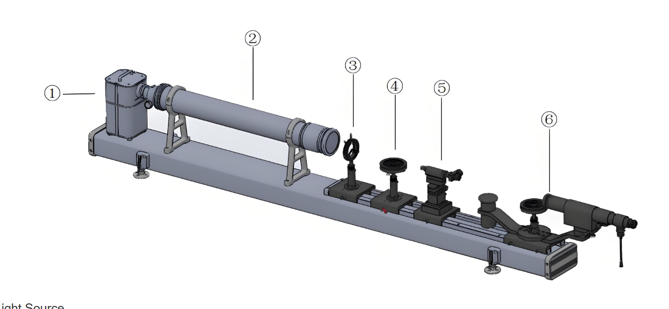 The main components of the instrument include a collimator, a base equipped with guide rails, and various auxiliary devices for different purposes, such as lens holders, reading microscopes, or various support stands. These auxiliary devices can all be mounted on the guide rails. The guide rails are equipped with a graduated scale, with a division value of 1 mm. Given its versatility, the optical bench is highly suitable for optical instrument production, scientific research, and educational applications in related fields.