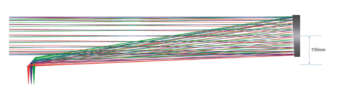 - The main reflector adopts an off-axis surface mirror, select the appropriate off-axis, so that the reflected optical path deviates from the optical axis, avoids the secondary reflector from interfering with the light-passing optical path, and ensure that the φ200mm light-permeable area is unobstructed.